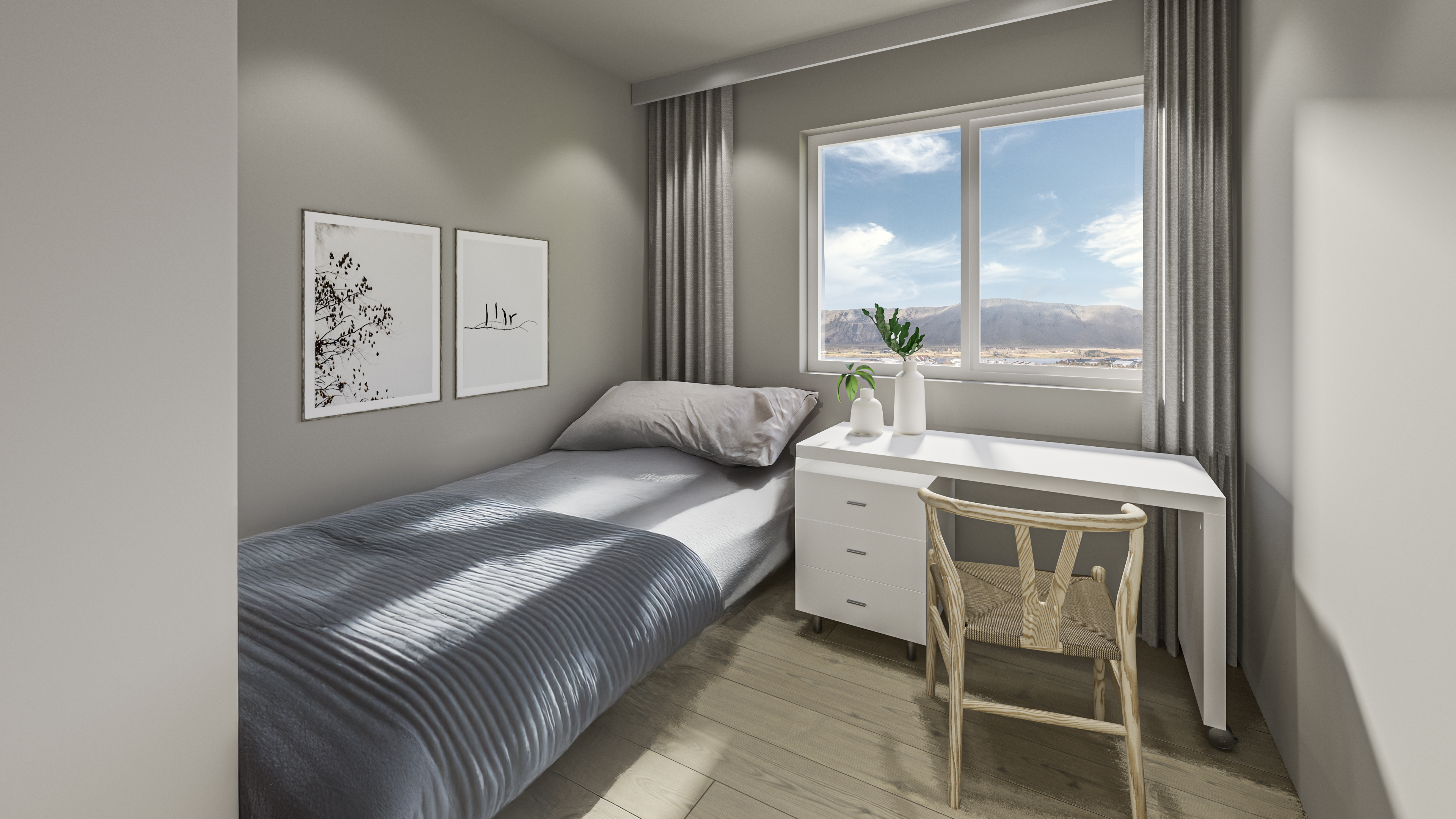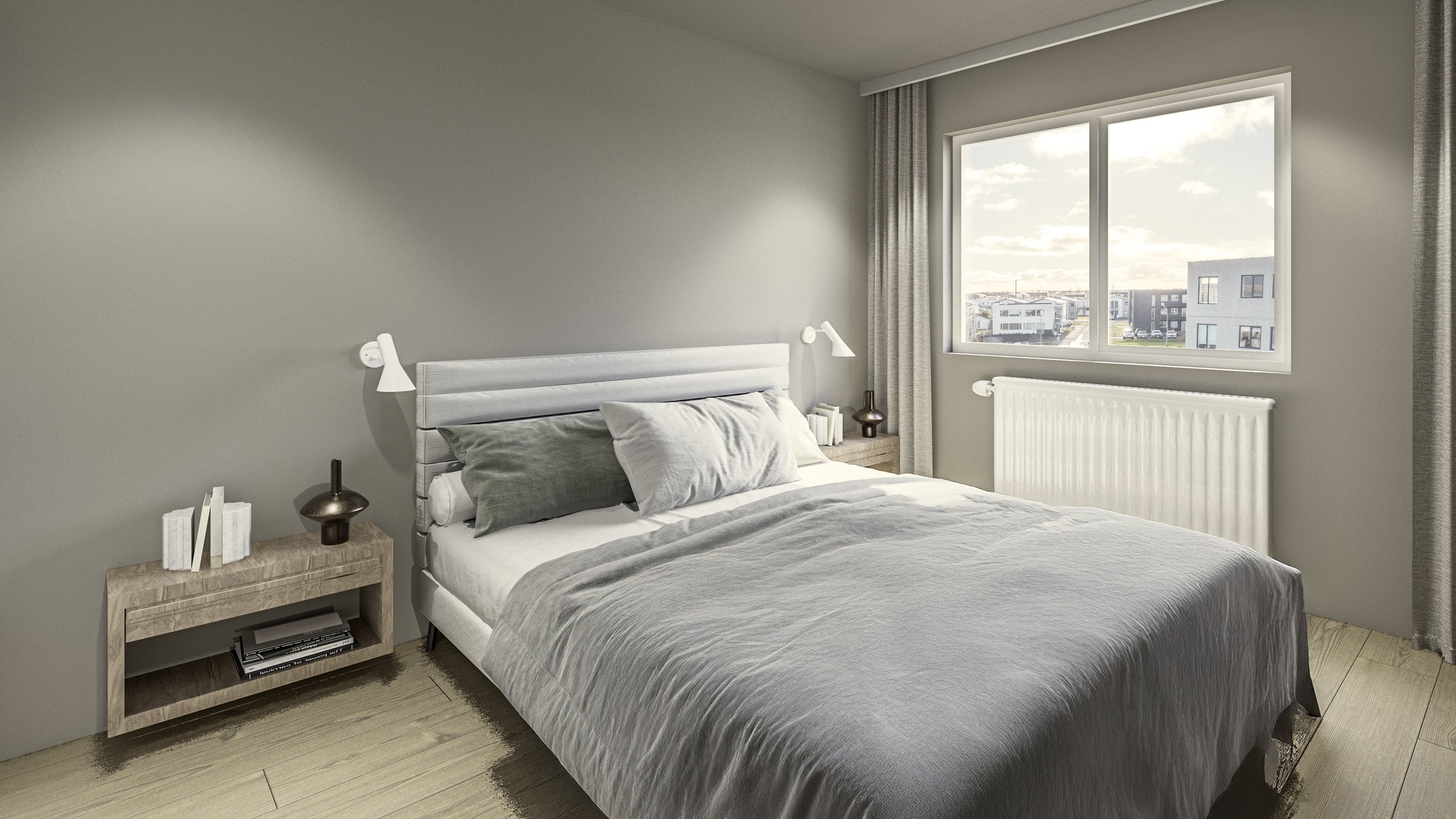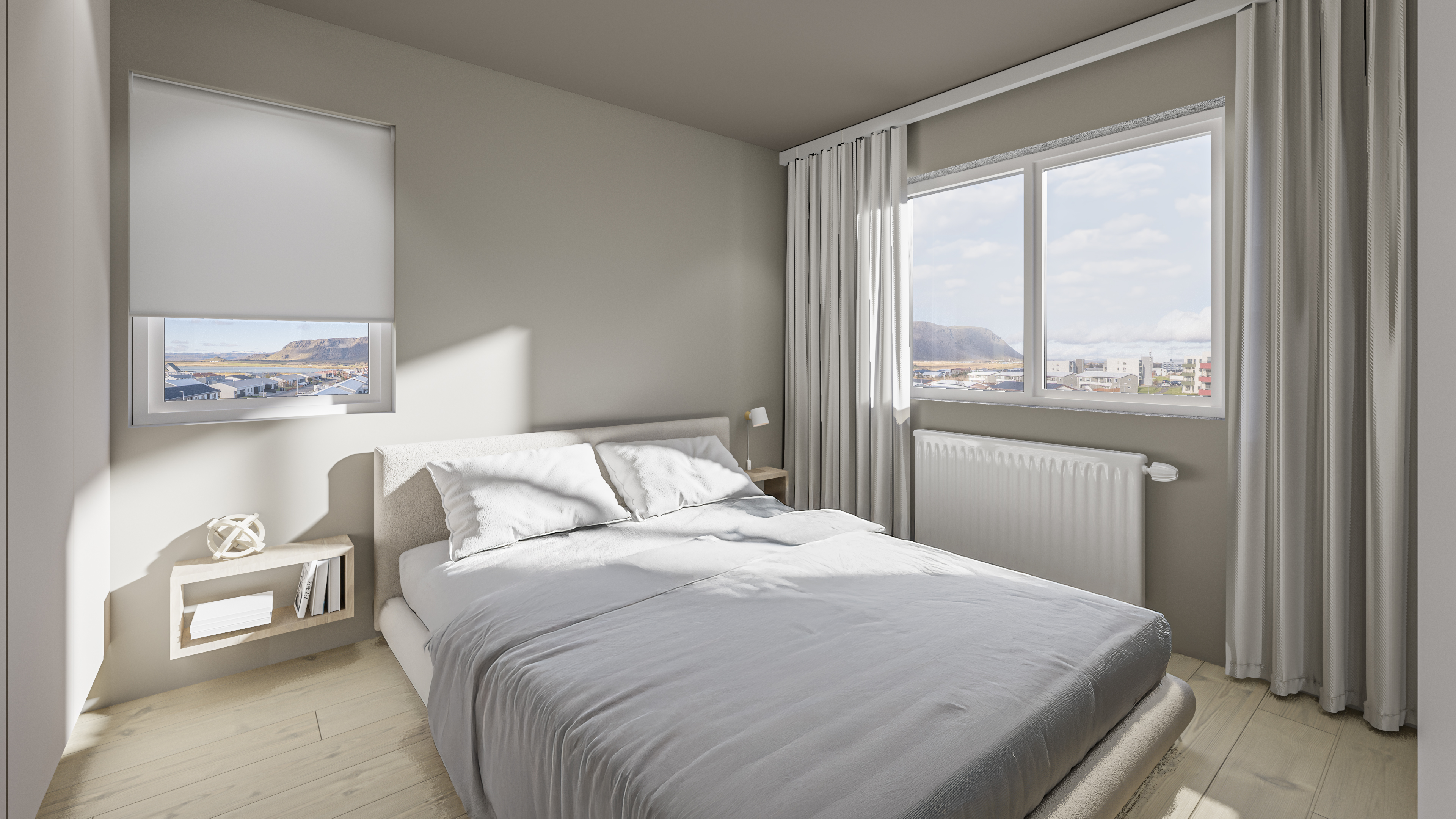 Gengið er inn í rúmgott anddyri með glugga. Úr anddyri er komið inn á gang með góðri geymslu strax á vinstri hönd en til hægri er hjónaherbergi með þreföldum skáp og tveimur gluggum.
