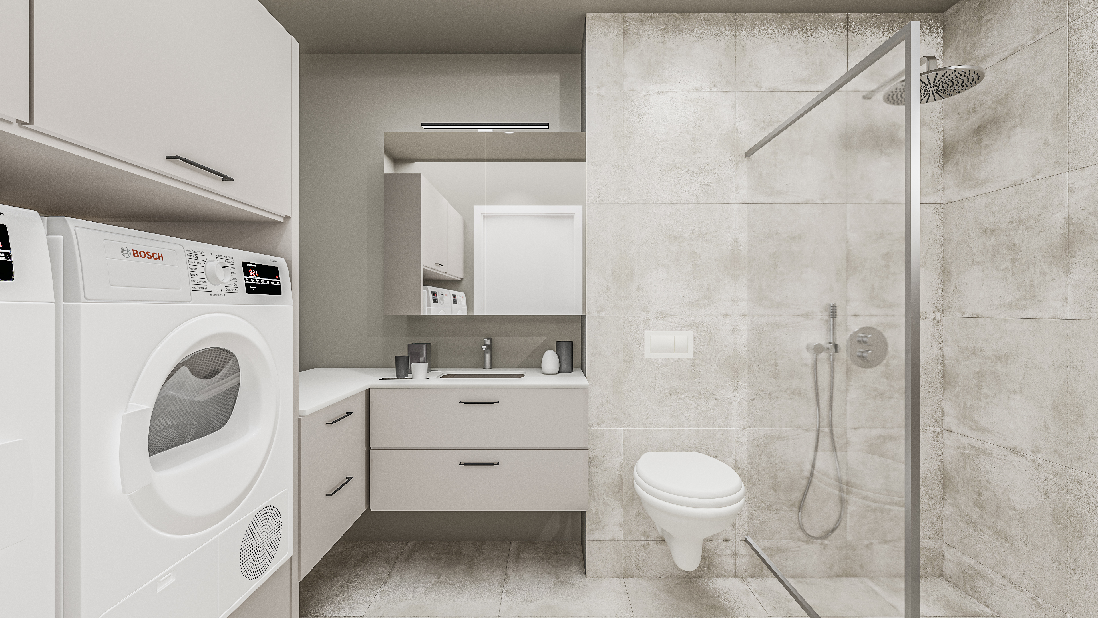 Við hlið geymslu er baðherbergi, flísalagt, með sturtu. Góð baðinnrétting með ísteyptum vaski og speglaskáp. Innrétting fyrir þvottavél og þurrkara er á baði. Framar á ganginum eru tvö herbergi með tvöföldum fataskápum og góðum gluggum.