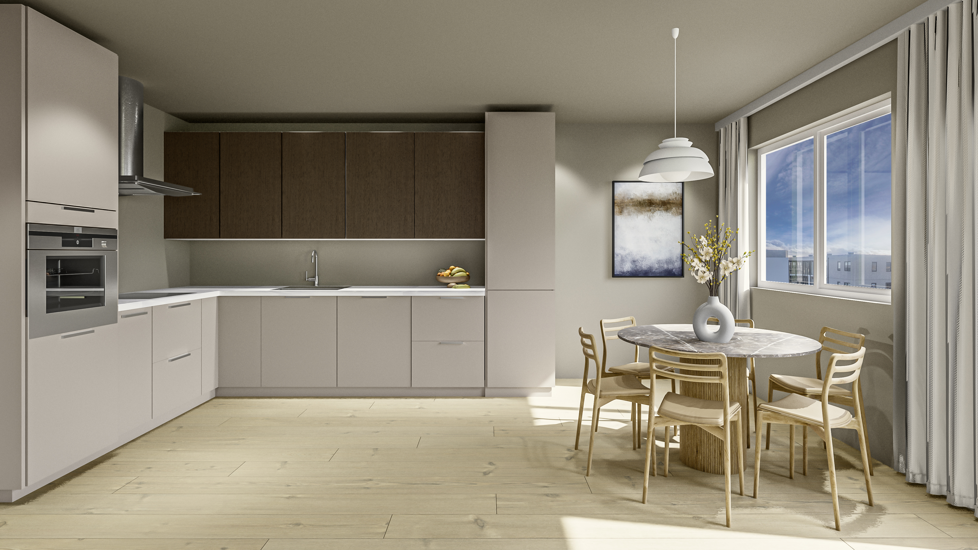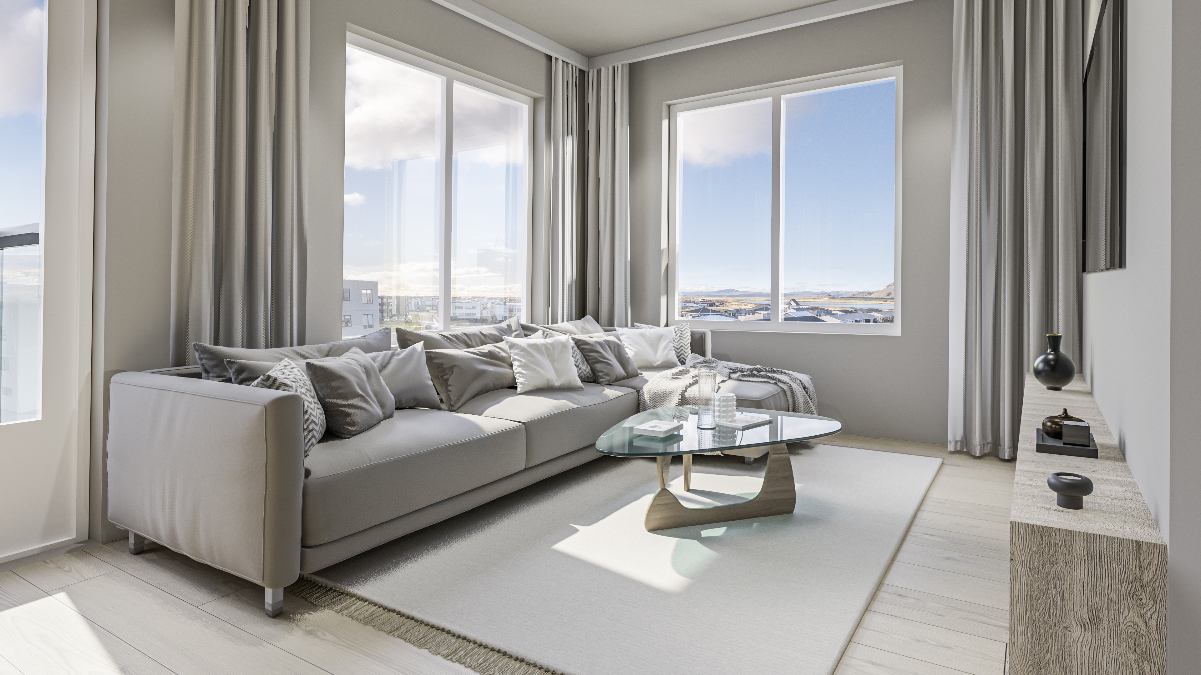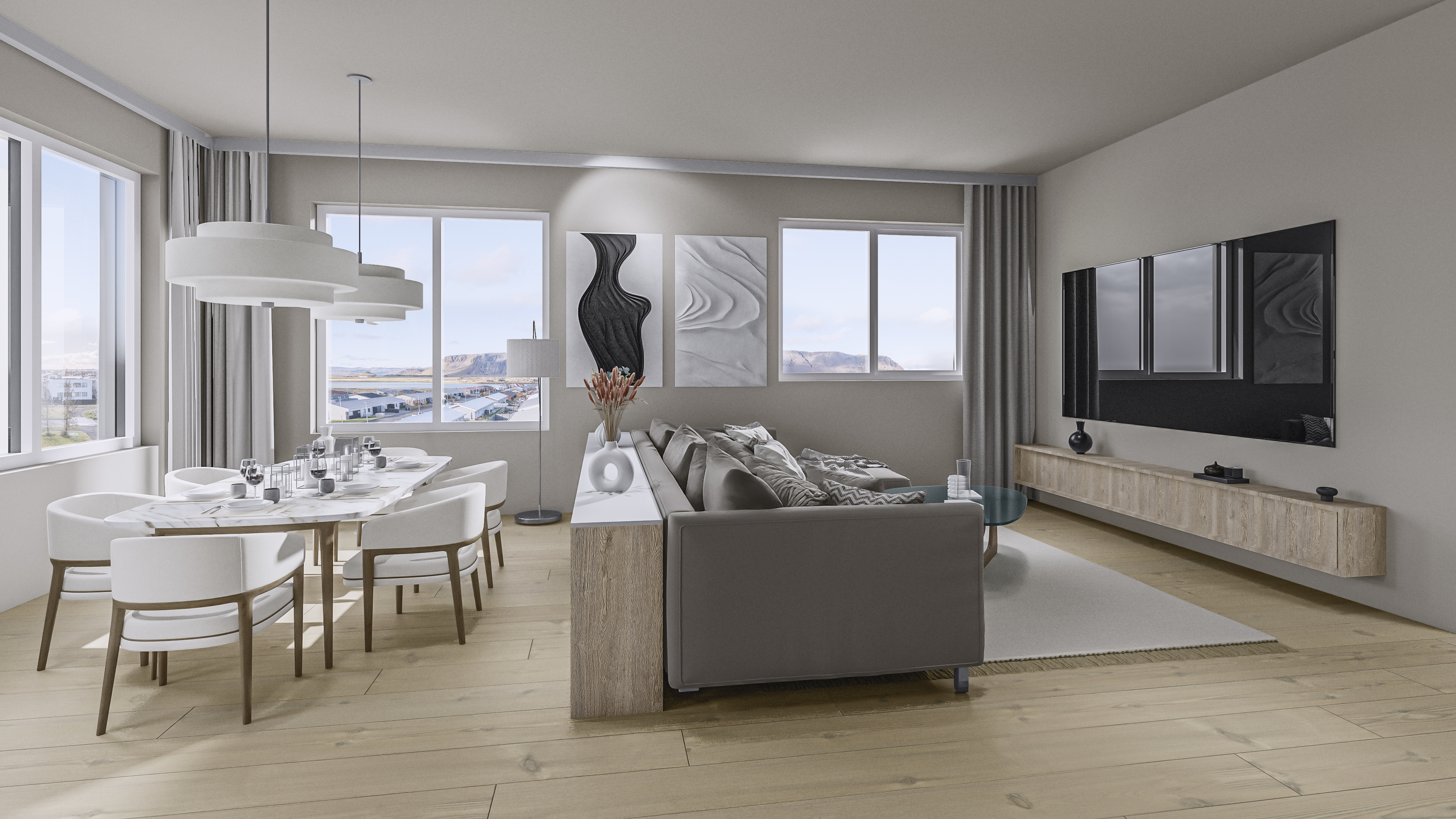 Alrýmið, eldhús, borðstofa og stofa, með veglegum gluggum. Úr alrými er gengið út á svalir/verönd.